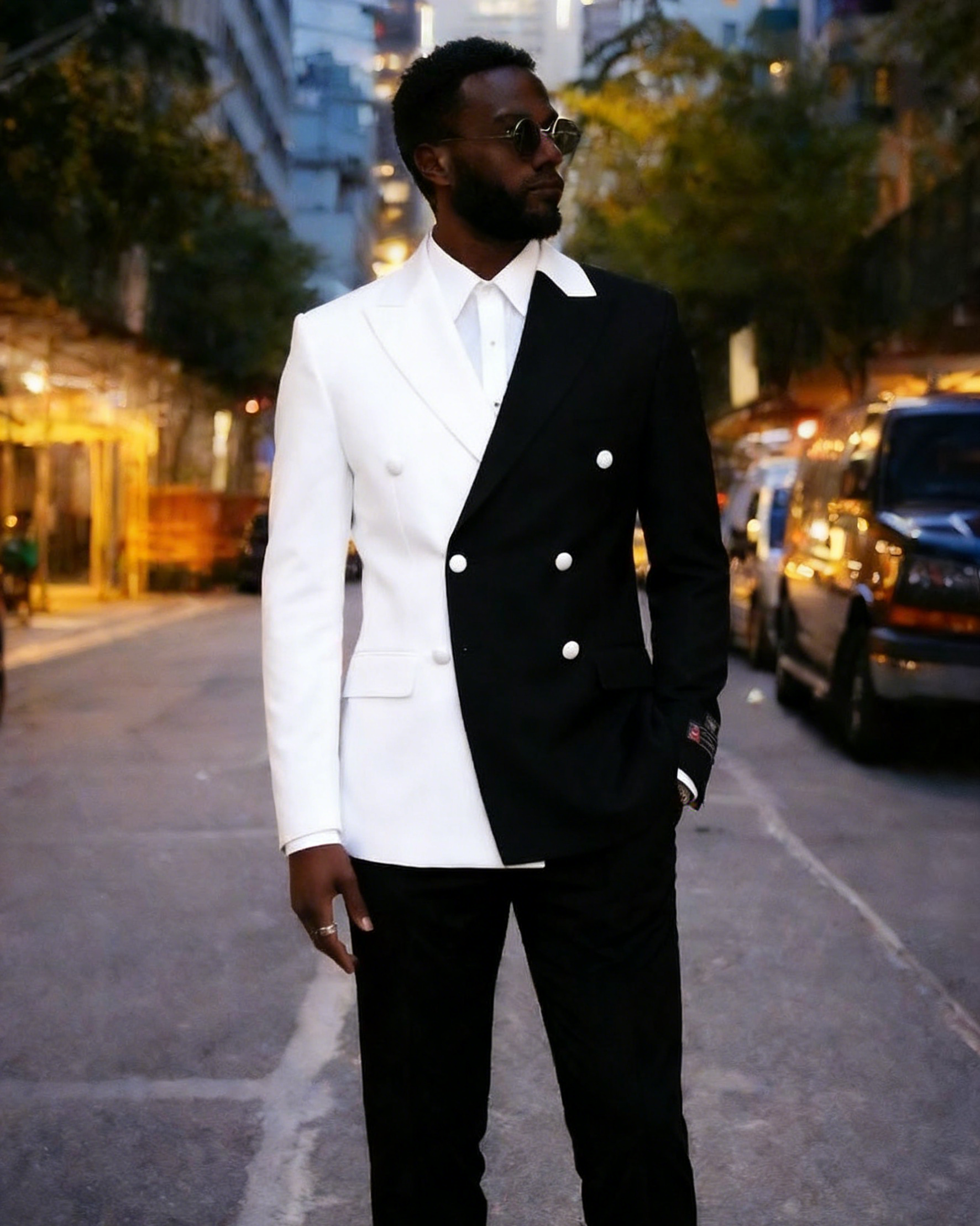 Experience modern elegance with the GooSuit White & Black 2-piece suit. Its double-breasted design and peaked lapel blend bold contrast with classic style. Perfect for proms, weddings and formal events, it offers full customization for a tailored fit.